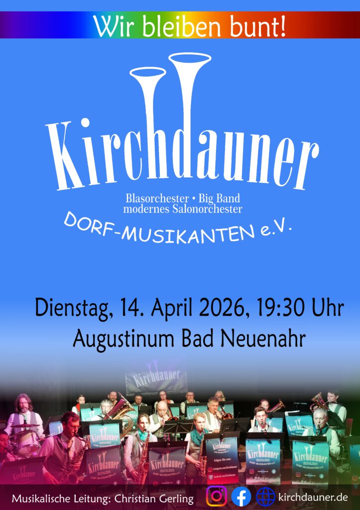 Neben unseren Auftritten auf diversen Festen, Veranstaltungen und Feiern treten wir zweimal im Jahr mit einem besonderen Konzertprogramm auf. Musikalischer Höhepunkt ist dabei das große Konzert im Konzertsaal des Bürgerhauses Kirchdaun. Die Termine finden Sie hier.